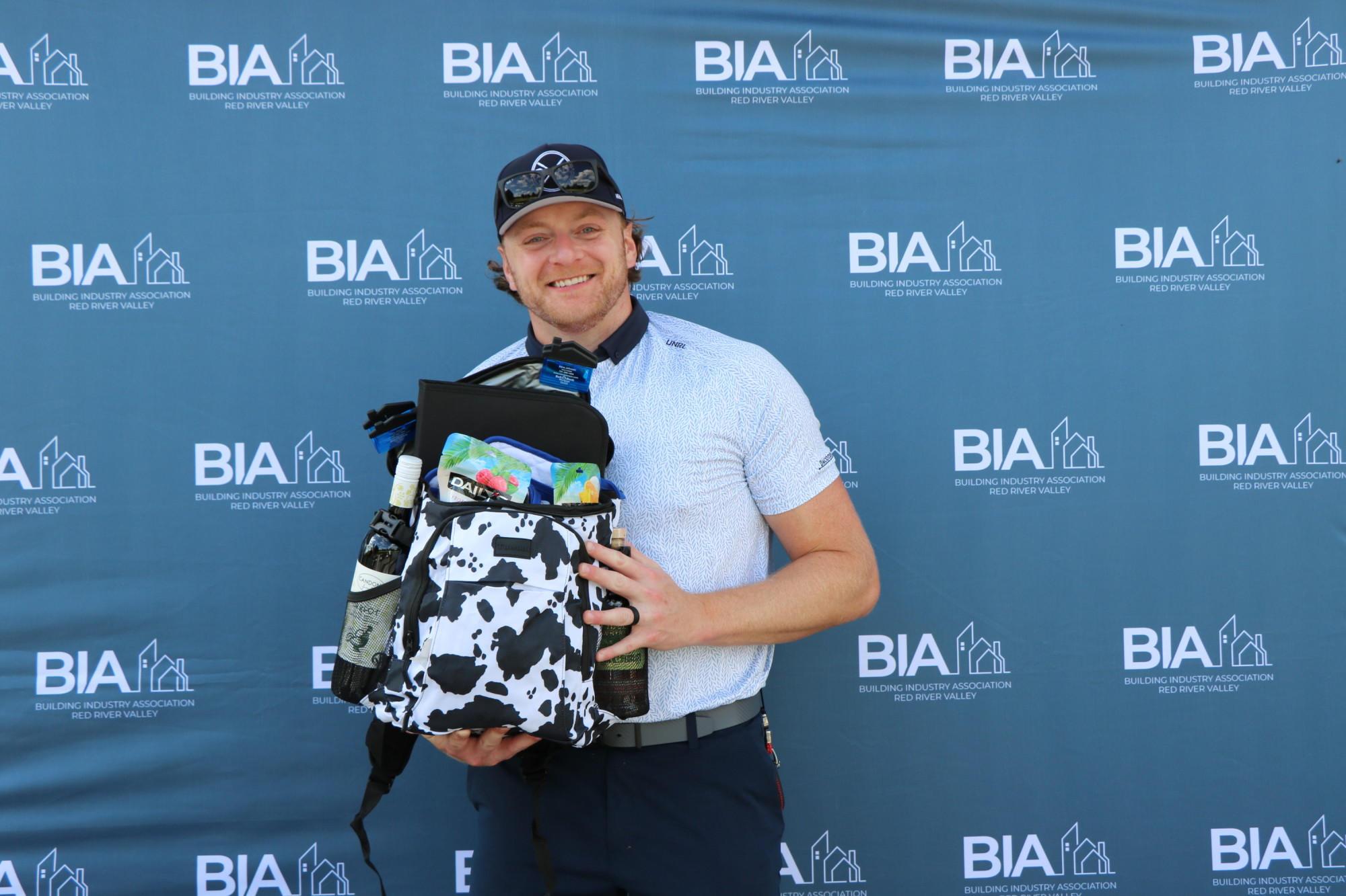 Dexter Werner of Dacotah Bank took home the Professional Women in Building Council's prize, a chillin' and grillin' themed cooler, and Cory Steiner of Cass County Electric Cooperative won OECS's bundle of summer items, including a cooler, tumbler and river tube. Clayton Roscoe with Krueger Construction took home ABC Supply's prize, a cornhole chipping game. D.C. Lucas of Eide Bailly LLP won Bell Bank's gift bag, featuring a hat, towel and golf balls. Tara DuBord of Wood Specialists Inc. won the Midco prize, a Bogg bag filled with goodies.